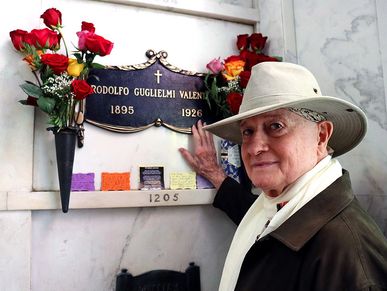 CHRISTOPHER paying his respects to MR. VALENTINO. CHRISTOPHER has a connection to VALENTINO: He lived in VALENTINO'S former home Falcon Lair for many years and is considered a top authority on Falcon Lair.