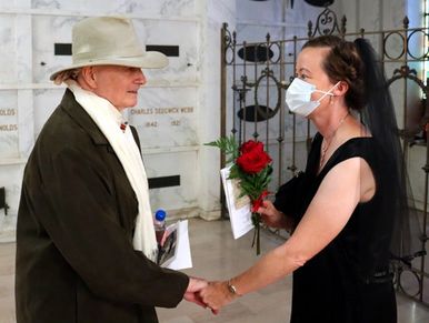 CHRISTOPHER chatting with KARIE BIBLE. She protrays the "Lady in Black" at the services each year.